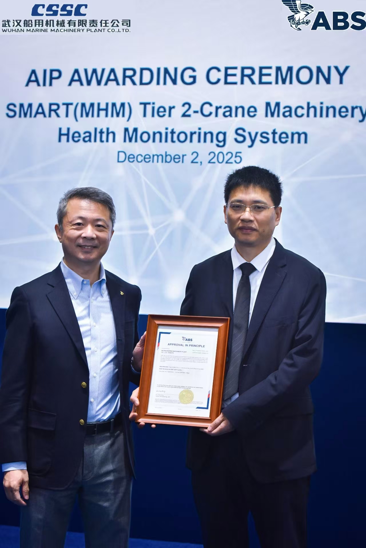 12月2日,2025年中國(guó)國(guó)際海事技術(shù)學(xué)術(shù)會(huì)議和展覽會(huì)開(kāi)幕首日,中船武漢船機(jī)開(kāi)發(fā)的海工吊機(jī)智能化健康監(jiān)測(cè)系統(tǒng)(SMART系統(tǒng))獲得ABS船級(jí)社SMART(MHM TIER 2)原則性批準(zhǔn)(AIP),這是國(guó)內(nèi)海工吊機(jī)首個(gè)成功取得該AIP認(rèn)證的系統(tǒng)。ABS船級(jí)社技術(shù)副總裁谷海、中船武漢船機(jī)副總經(jīng)理胡發(fā)國(guó)出席發(fā)證儀式。